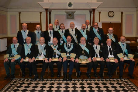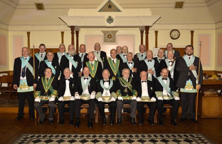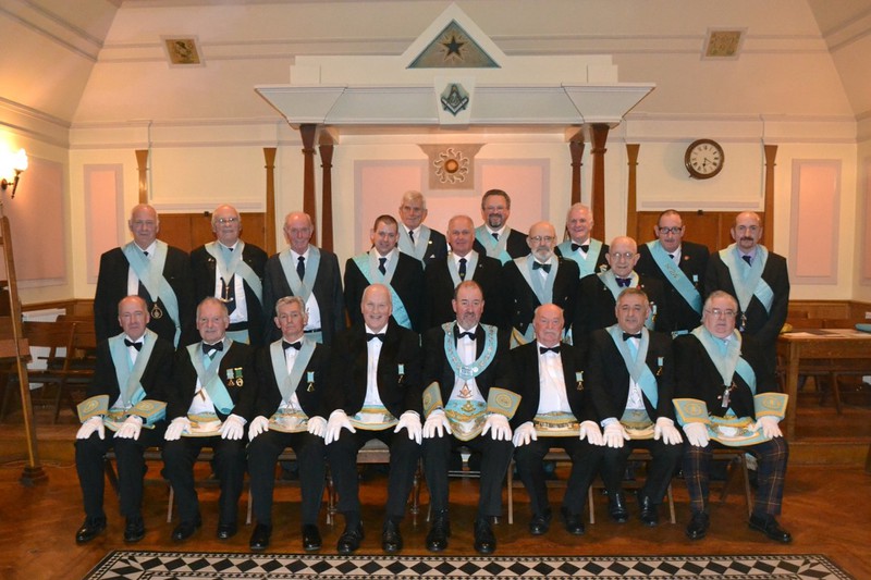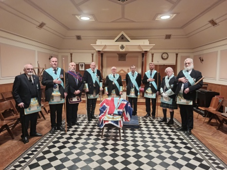 The Degree team consisted of from left to right, IG Bro.George Young No24, Bro.Andrew Forsyth RWPGM who imparted the secrets,SD Bro.Mike Todd PM58, SW Bro. David Johnston No24, RWM Bro. George Gilchrist No24, SW BroThomas Wilson RWM No1066, JD Bro. Stuart Fleming No262,Chaplain Bro.Carl Surgey No262. and Bro.Georgie McPeat RWM No936. Missing from the photo is Bro. Andrew Henthorn No24 who delivered the lecture on the 2nd degree tracing board.